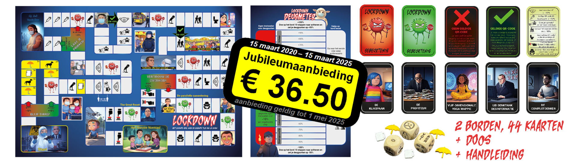 Lockdown is een spel met twee spelborden voor 2-6 personen. Op het ene bord moet je zo snel mogelijk naar Het Nieuwe Normaal terwijl je tegelijkertijd op het andere bord je deugscore binnen de perken moet houden. Bij het spel zitten 44 speelkaarten, 3 unieke dobbelstenen en diverse spelfiches. Dit alles in een mooie doos en met duidelijke handleiding.
